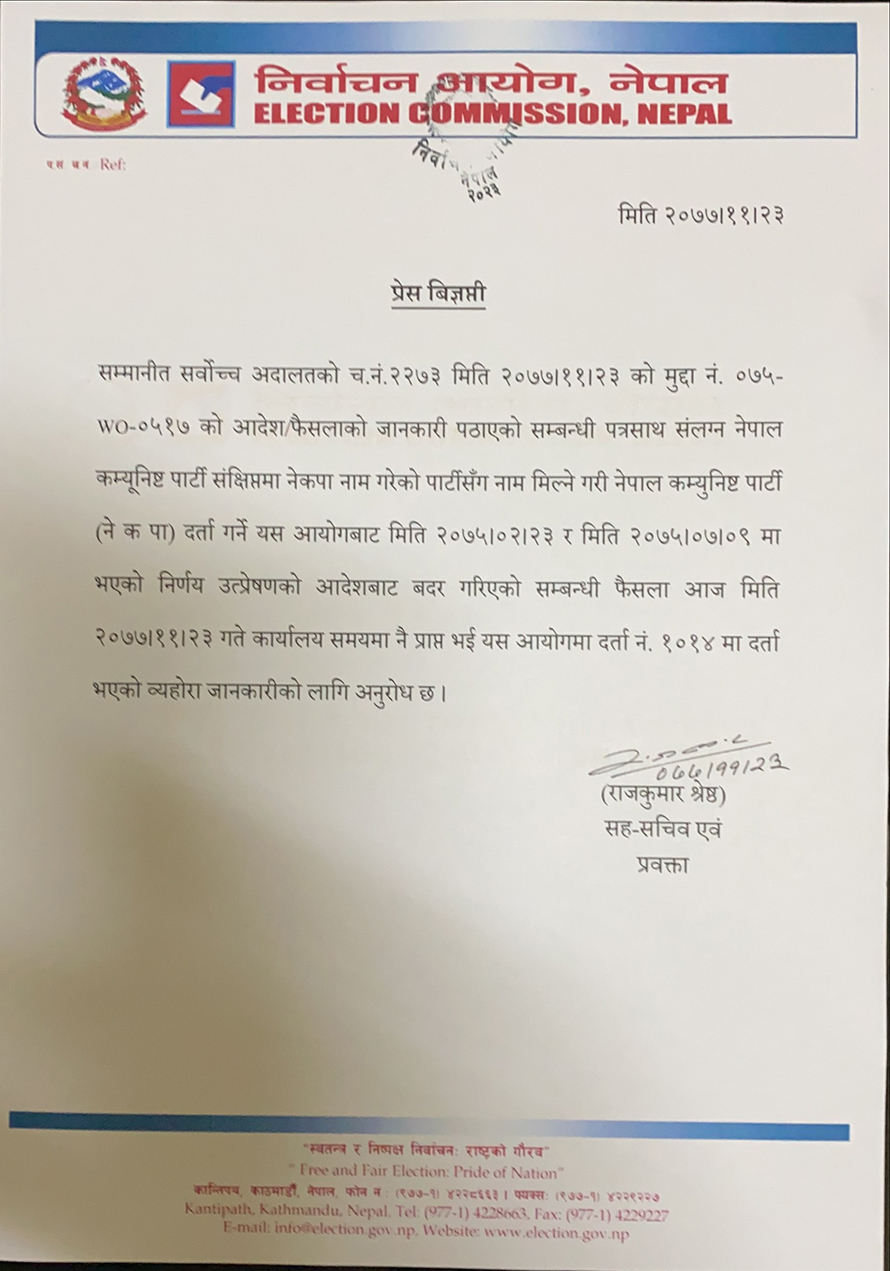 नेकपाको नाम सम्बन्धी सर्वोच्च अदालतको फैसला निर्वाचन आयोग पुगेको छ । आइतबार नै जारी भएको सर्वोच्चले फैसला कार्यालय समयमै आइपुगेको आयोगले जनाएको हो ।