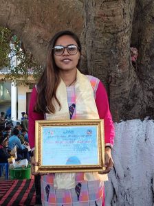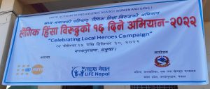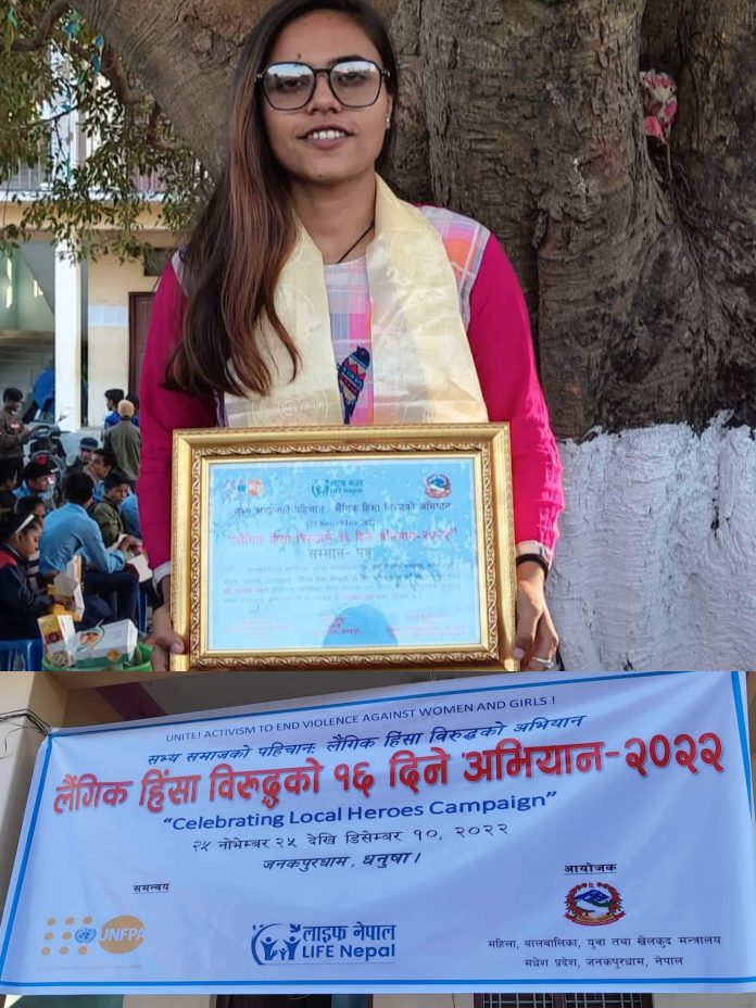 जनकपुरधाम, मंसिर १० । जनकपुरधाममा सभ्य समाजको पहिचान: लैंगिक हिंसा विरुद्धको अभियान लैंगिक हिंसा विरुद्धको १६ दिने अभियानमा सेलिब्रेटिङ लोकल हिरोज अभियान बाट धनुषाकी काजल झा समानित भएकीछिन्।