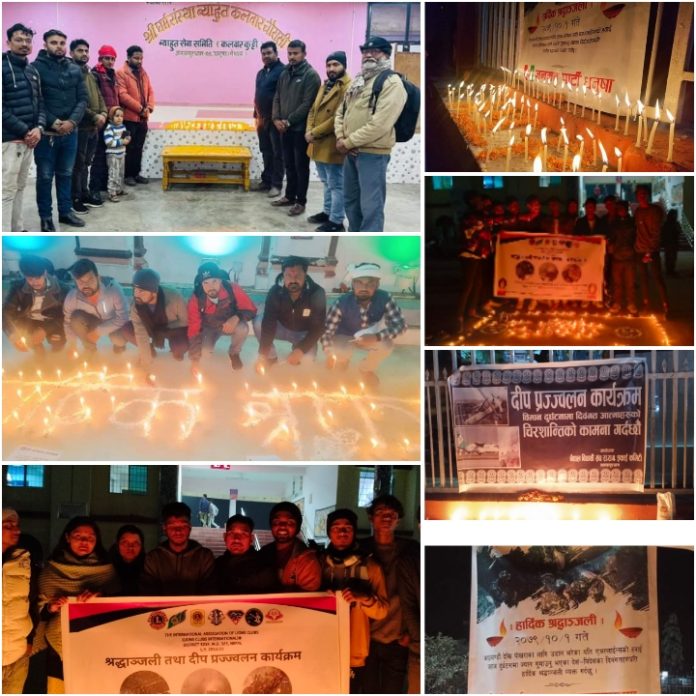 सोमबार साँझ विभिन्न समूहहरुले जनकपुरधामका विभिन्न स्थानहरुमा मृतकहरुप्रति श्रद्धाञ्जली अर्पण गर्न दीप प्रज्वलन गरेका हुन्।