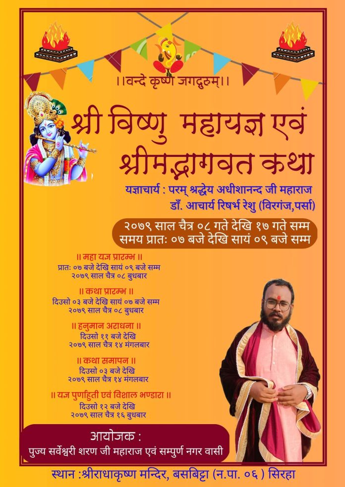 जनकपुरधाम,फाल्गुन ३ । सिरहाको वडा नं. ६ बसबिट्टा स्थित श्री राधाकृष्ण मन्दिर प्राङ्गणमा चैते दशैँको पावन अवसरमा वैश्विक कल्याणको उद्देश्यको साथ ९ दिवसीय श्री विष्णु महायज्ञ एवं श्रीमद्भागवत कथा हुने भएको छ । यस विष्णु महायज्ञ एवं श्रीमद्भागवत कथाका बारेमा जानकारी एवं महायज्ञका आयोजक मन्दिरका महन्थ श्री सर्वेश्वरी शरण बाबाले दिनुभएका छन् ।
