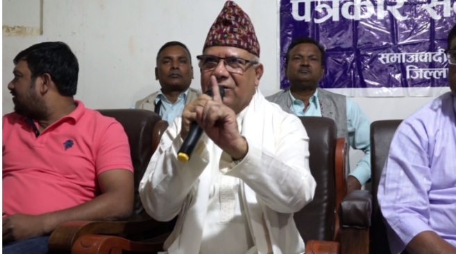 जनकपुरधाममा शुक्रवार समाजवादी पत्रकार संगठन धनुषाले आयोजना गरेको पत्रकार सम्मेलनमा बोल्दै अध्यक्ष नेपालले यो प्रदेश मेरो त्यो प्रदेश तिम्रो भन्ने स्थिती नरहेकाले सबै सरकारमा गठबन्धनकारी दलहरुले नेतृत्व पाउनुपर्ने बताएका छन् । चितवन, तनहुँ र बाराको उपनिर्वाचनको परिणामले हालका देशका मुख्य मुलधारका पार्टीहरु समयमै समिक्षा सहित सुध्रिन संन्देश दिएकाले त्यसको तत्कालै समिक्षा र सुधार हुन आवयश्क रहेको उनको जिकिर छ ।उनले अव ७० लागेका नेताहरु आराम गर्नुको विकल्प नरहेको भन्दै उनले स्वयम आफु लगायत त्यस्ता सम्पुर्ण नेताहरुलाई पुस्तान्तरणका लागि आहवान गरेका छन् । देशमा आर्थिक संकटका बिच प्रचण्ड नेतृत्वको सरकारले आफनै नेतृत्वको जनयुद्वका अयोग्य लडाकुहरुलाई दुई दुई लाख दिने निर्णयको उनले विरोध गरेका छन् । उनले यस्तो आर्थिक अवस्थामा यो निर्णय भर्खरै गरिएको हो भने गलत रहेको बताए ।आफुलाई धेरै कुरा थाहा नरहेको बताउदै उनले यो निर्णय पहिलाकै हो कि नयाँ हो ? भन्ने विषयमा प्रधानमन्त्री प्रचण्डले यस्को विषयमा स्पष्ट पार्नुपर्ने बताए । उनले समाजवादी मोर्चाका लागि पनि अव पहल सुरु हुने बताए । माओवादी र जसपासंग मात्र होइन बिप्लव समुह संग समेत कुराकानी भइरहेको बताउदै उनले कम्युनिष्ठ आन्दोलन बचाउन मोर्चा गरिने बताए ।पत्रकार सम्मेलनमा समाजवादी पत्रकार संगठनका धनुषा अध्यक्ष अकुल प्रसाद साह, प्रदेश अध्यक्ष प्रविण साह, पार्टीका केन्द्रिय उपाध्यक्ष धर्मनाथ प्रसाद साह नेताहरु रामचन्द्र झा, सत्रुधन महतो, रामअवतार यादव, लाल गोइत, गोविन्द न्यौपाने, शितल झा, वृहतर जनकपुरधाम क्षेत्र विकास परिषदका अध्यक्ष शितल साह सहितको उपस्थिती थियो ।