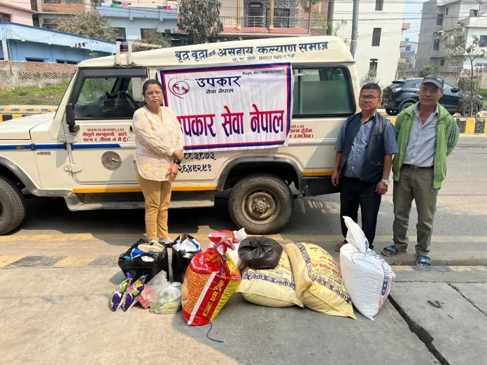 हरेक महिना खाद्यान्न सहयोग गर्दै आएको उपकार सेवा नेपालले फागुन महिनामा पनि ठोरी गाउँपालिका वडा नम्बर १ भगवाननगर स्थित वृद्ध–वृद्धा आश्रममा आश्रीत २३ जनालाई दैनिक उपभोगका लागि दाल, नून खानेतेल, चना, सोयाविन, चामल पिठो, भुजा, चाउचाउ, बिस्कुट सेनेटरी प्याड, डाइपर, फिनाईल साबुन लगायतको दैनिक उपभोग्य सामाग्री उपलब्ध गराएको हो ।