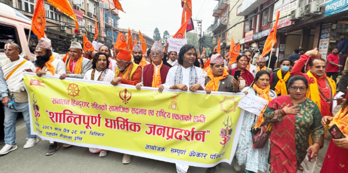 ‘सनातन हिन्दु राष्ट्रसहितको सामाजिक सद्भाव तथा राष्ट्रिय एकताको लागि धार्मिक जनप्रदर्शन’ शीर्षकमा आयोजित उक्त र्यालीमा सम्पूर्ण ॐकार परिवारका धार्मिक संघसंस्थाहरूको सक्रिय सहभागिता थियो।