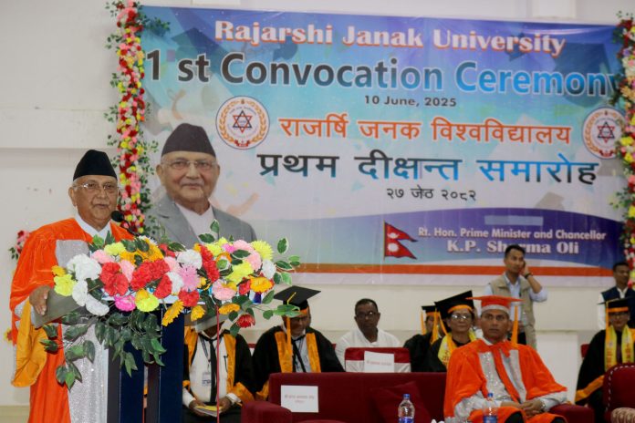राजर्षि जनक विश्वविद्यालयको पहिलो दीक्षान्त समारोहलाई सम्बोधन गर्दै विश्वविद्यालयको कुलपति एवं प्रधानमन्त्री ओलीले राजर्षि जनक विश्वविद्यालयमा अध्ययनरत विद्यार्थीहरू पहिलो पटक दीक्षित भएकोमा खुसी व्यक्त गर्दै जनकपुरधाम पहिले देखि नै ज्ञानको भूमि भए पनि यहाँ विश्वविद्यालय अहिले आएर स्थापना हुनुमा कुव्यवस्था दोषी रहेको बताए । उनले अब आउने दिनमा यस्ता कमजोरीहरूलाई वास्तविक प्रजातन्त्रको अभ्यास गर्दै हटाउँदै लैजाने प्रतिबद्धता व्यक्त गरे ।