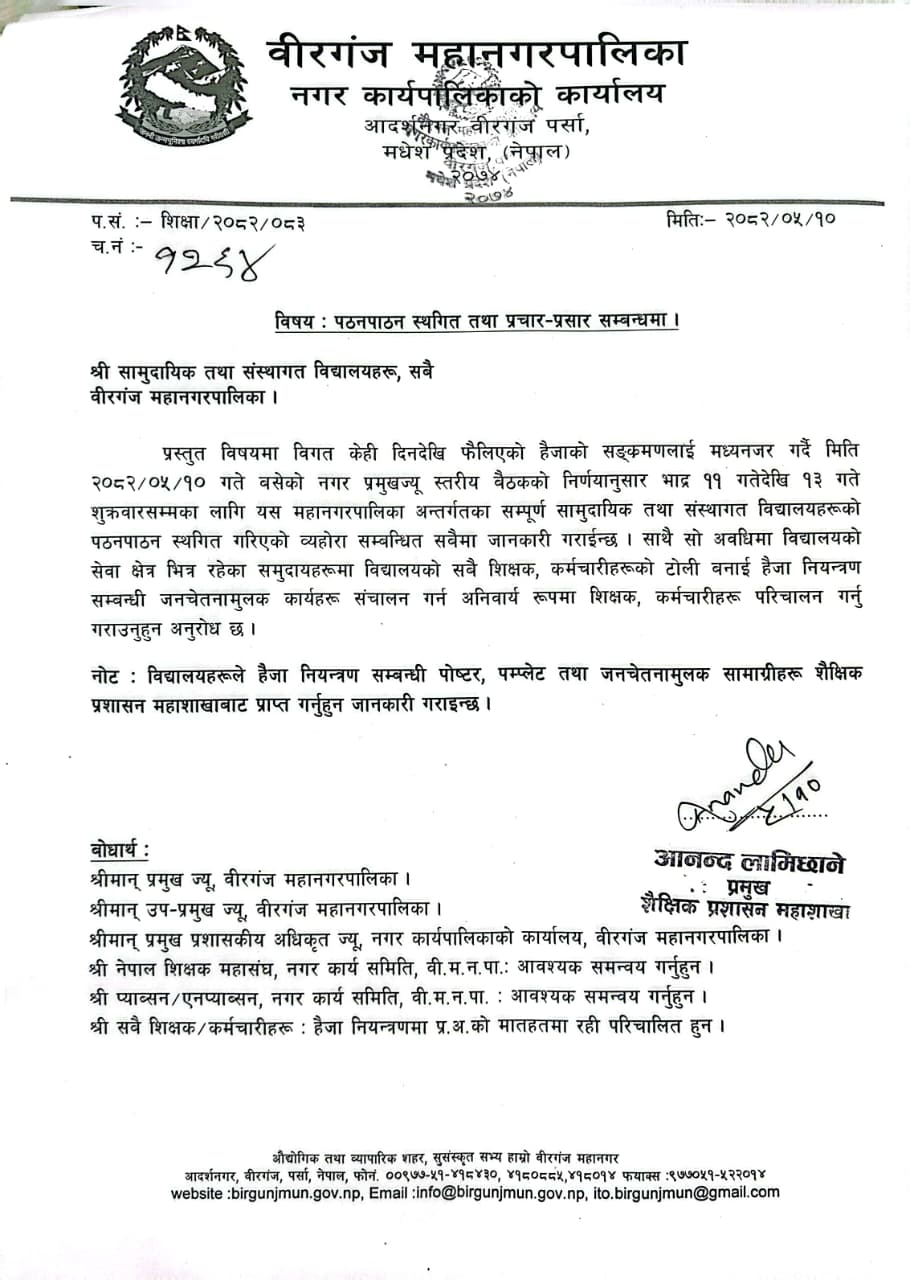 वीरगञ्ज । हालै फैलिएको हैजाको प्रकोपलाई ध्यानमा राख्दै वीरगञ्ज महानगरपालिकाले सामुदायिक र निजी विद्यालयहरू भदौ ११ गतेदेखि १३ गते (शुक्रबार) सम्म बन्द गर्ने निर्णय गरेको छ। मंगलबार तीज पर्वका कारण विद्यालय स्वतः बन्द हुने भएकाले महानगरले शुक्रवारसम्मका लागि पठनपाठन स्थगित गरिएको हो।