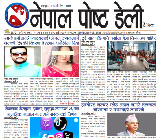 E-paperसमाचारदेश 5.1 C Kathmandu 10.6 C Birgunj आज मिती २०८२–०५–१९ गतेको पत्रिका ५ महिना अगाडि 10 0 Nepal Post Daily सिफारिस समाचार ने.का.पा. एमाले पर्सा निर्वाचन क्षेत्र नं. १ का उम्मेदवार प्रदीप यादव मनोनयन दर्ता गराउन निर्वाचन कार्यालय। PHOTO FEATURE Banner पर्सामा अवैध बालुवा उत्खनन, १०० ट्रिपभन्दा बढी बालुवा फेला Banner “एमाले प्रवेशको हल्ला असत्य : जसपा नेपालमै छु” – प्रदीप यादव देश सशस्त्र प्रहरी बल बाराका प्रमुख खुम के.सीकाे सरुवा Banner अवसरवादको राजनीतिमा अगाडि बढ्दै जसपा पर्साको अध्यक्ष बने तवरेज अहम्द Banner टिकट नपाए पनि म पार्टी छाड्दिनँ : अजय द्विवेदी Nepal Post Dailyhttps://nepalpostdaily.comNepal post daily is Nepal's Leading news website. Contact Person Santosh Sah : 9807184362 Office : 051520040 NPD_2082-05-20_19 FacebookTwitterPinterestWhatsApp ताजा समाचार Banner अगुवा कार्यकर्तासँगको अन्तरक्रियाले प्रदीप यादव र रीमा कुमारी यादवको अभियान थप सशक्त देश अमेरिकाबाट ८० जना नेपाली नागरिक डिपोर्ट Banner निर्वाचन अवधिभर सोशल मिडिया निगरानी कडा गर्ने सरकारको निर्णय देश उच्चस्तरीय चिनियाँ टोली तीनदिने भ्रमणका लागि नेपाल आउँदै Banner चुनाव लड्न मन्त्री, मेयरदेखि वडा सदस्यसम्म ३६ जनाले दिए राजिनामा विजनेश नेप्से ९.४३ अंकले घट्यो Banner सप्तरीका चार प्रतिनिधिसभा सिटमा १ सय ४ उम्मेदवार मैदानमा थप समाचार