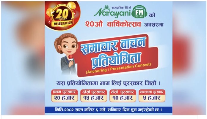 बीरगन्ज,२१ कात्तिक । बीरगन्जस्थित सामुदायिक रेडियो नारायणी एफएम १०३.८ मेगाहर्ज ले आफ्नो २०औँ वार्षिकोत्सवको अवसरमा ‘समाचार वाचन प्रतियोगिता’ आयोजना गर्ने भएको छ।