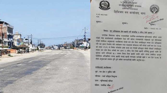 कार्यालयले एक सार्वजनिक सूचना जारी गर्दै वन ऐन, २०७६ को दफा ४९ ९ग० को व्यवस्थाविपरीत वन क्षेत्रभित्र अनाधिकृत रूपमा निर्माण गरिएका घरटहरा र सञ्चालनमा रहेका व्यवसायहरूलाई ३ दिनभित्र हटाउन निर्देशन दिएको छ। लामो समयदेखि सरकारी वन क्षेत्र ओगटेर बसोबास र व्यापारिक प्रयोजनमा प्रयोग भइरहेका संरचनाहरूका कारण वन संरक्षणमा चुनौती थपिएपछि प्रशासनले यस्तो अल्टिमेटम दिएको हो । यस अतिक्रमणको चपेटामा परेको क्षेत्रको सीमांकन गर्दै कार्यालयले पूर्वमा वन क्षेत्र तथा दुधौरा नदी, पश्चिममा पर्सा राष्ट्रिय निकुञ्ज, उत्तरमा चुरियामाई मन्दिर र दक्षिणमा पथलैया चोकसम्मको क्षेत्रलाई चारकिल्ला तोकेको छ ।
