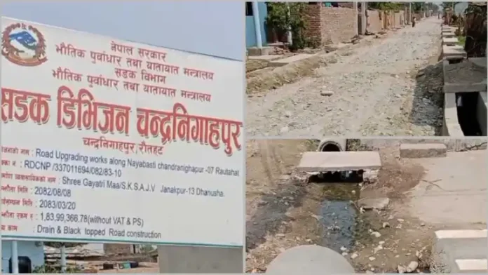रौतहट,१३ वैशाख । रौतहटको चन्द्रपुर नगरपालिका–७ नयाँबस्ती टोलमा सडक र नाला निर्माणमा अनियमितता भएको भन्दै स्थानीयवासीले विरोध जनाएका छन्। निर्माण कार्य गुणस्तरहीन भएको र सरकारी निकायभित्रै मिलेमतो भएको आरोप स्थानीयले लगाएका छन्।